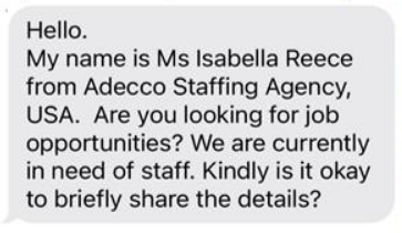 Victims are also targeted through text messages offering “work at home” opportunities. Once the victim responds to the text, the criminal then begins a conversation that leads to an “opportunity to invest” or a job working from home where they are asked to use their bank account to deposit checks and transfer the funds as part of a bookkeeping job, or use the funds to buy gift cards as part of a mystery shopping job.